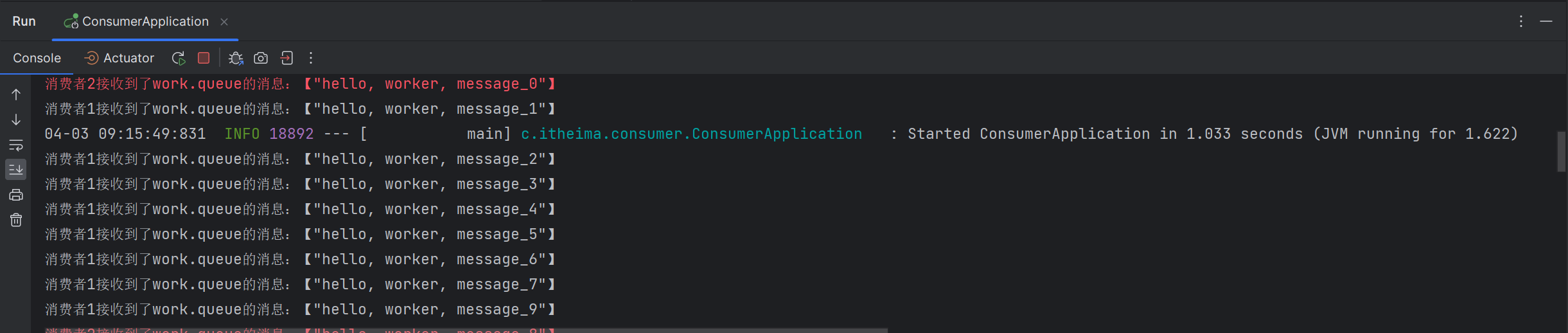 System.out.println("消费者1接收到了work.queue的消息:【" + msg + "】");